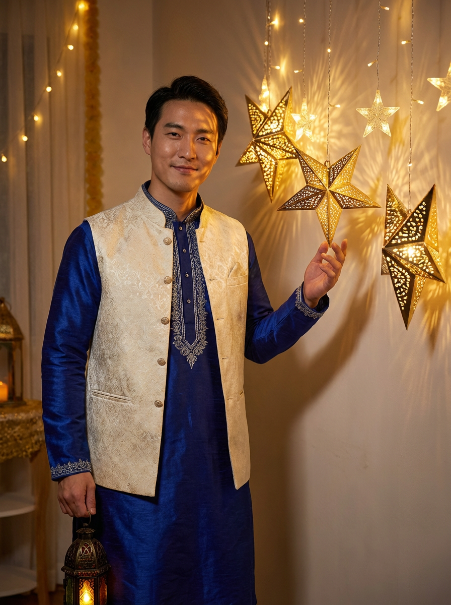 a model in a festive kurta with traditional vest, striking a pose with beautiful Eid decorations casting intricate light patterns