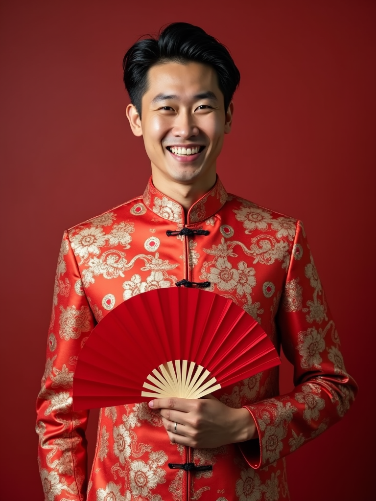 a model in a festive Tang suit with traditional elements, embodying the joyful and prosperous nature of Chinese New Year, with a red fan or lucky ornament in hand