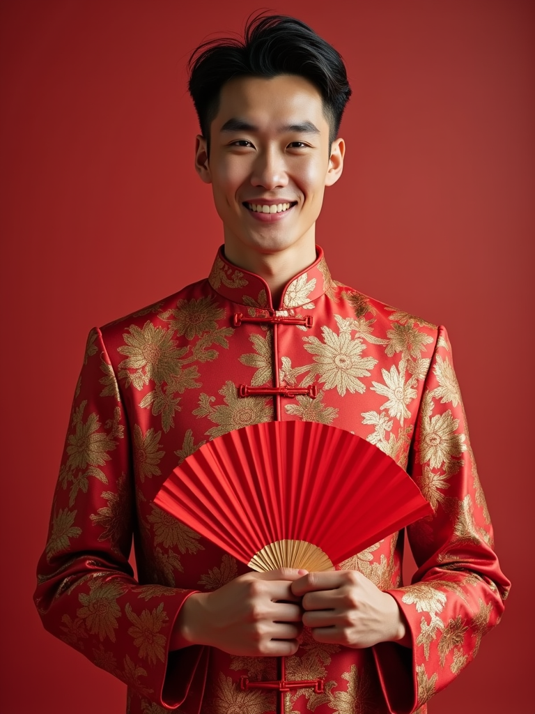 a model in a festive Tang suit with traditional elements, embodying the joyful and prosperous nature of Chinese New Year, with a red fan or lucky ornament in hand