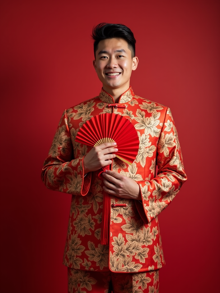 a model in a festive Tang suit with traditional elements, embodying the joyful and prosperous nature of Chinese New Year, with a red fan or lucky ornament in hand