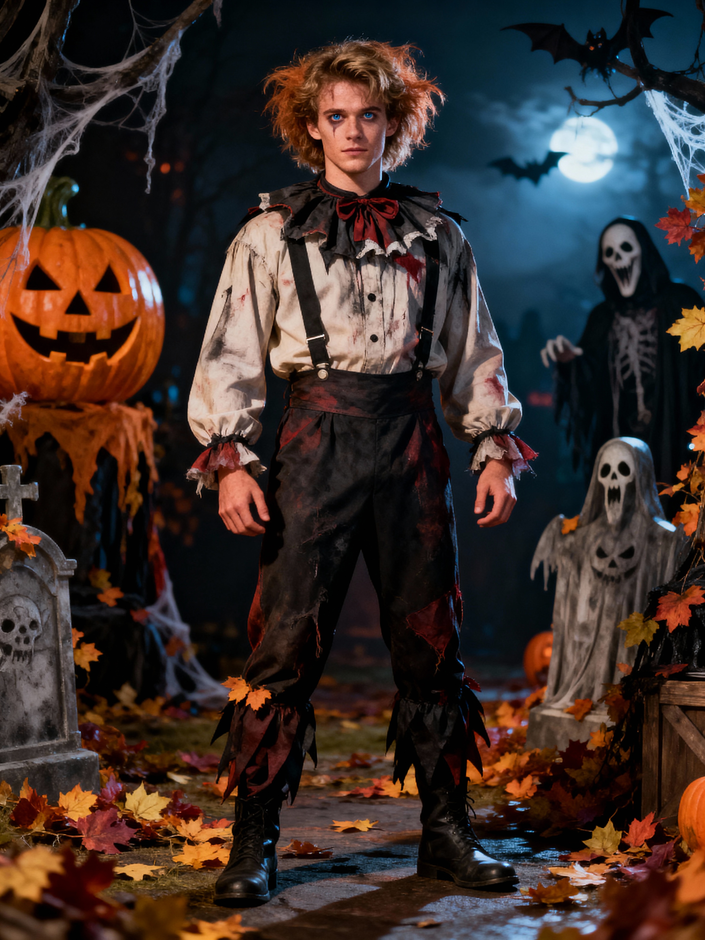 A model in a halloween costume, standing confidently in front of a Halloween-themed backdrop with spooky decorations and autumn leaves.