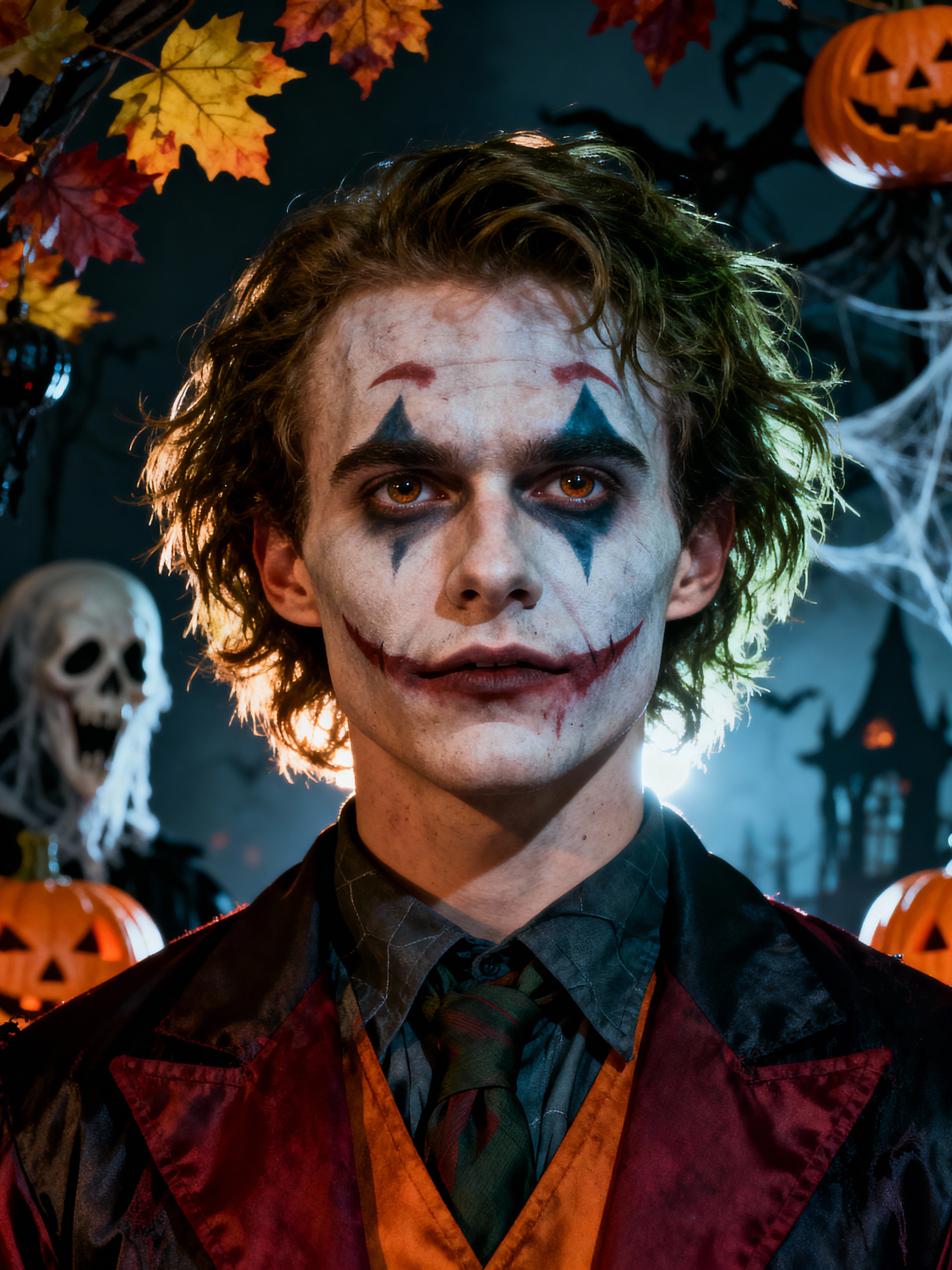 A model in a halloween costume, standing confidently in front of a Halloween-themed backdrop with spooky decorations and autumn leaves.