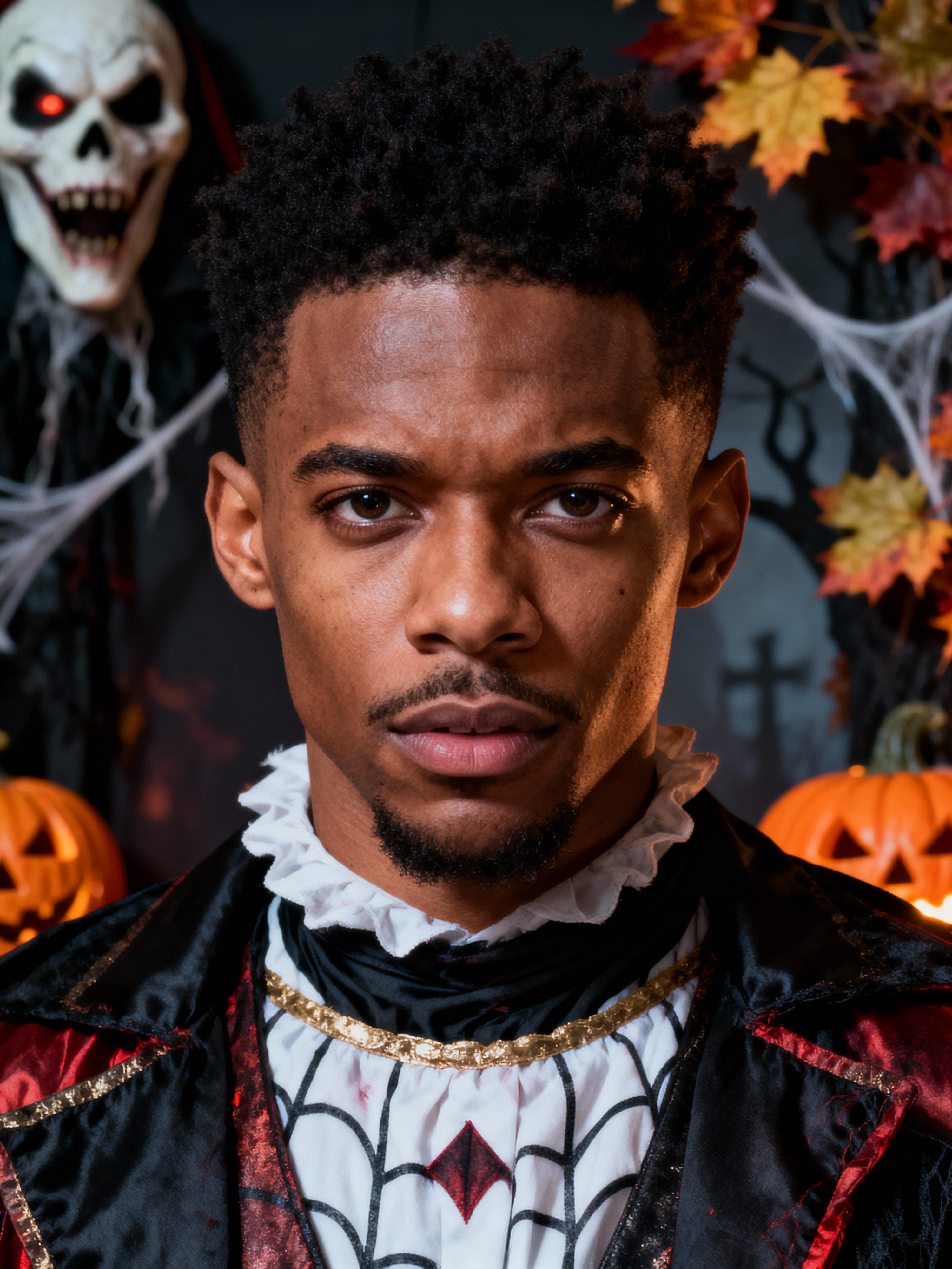 A model in a halloween costume, standing confidently in front of a Halloween-themed backdrop with spooky decorations and autumn leaves.
