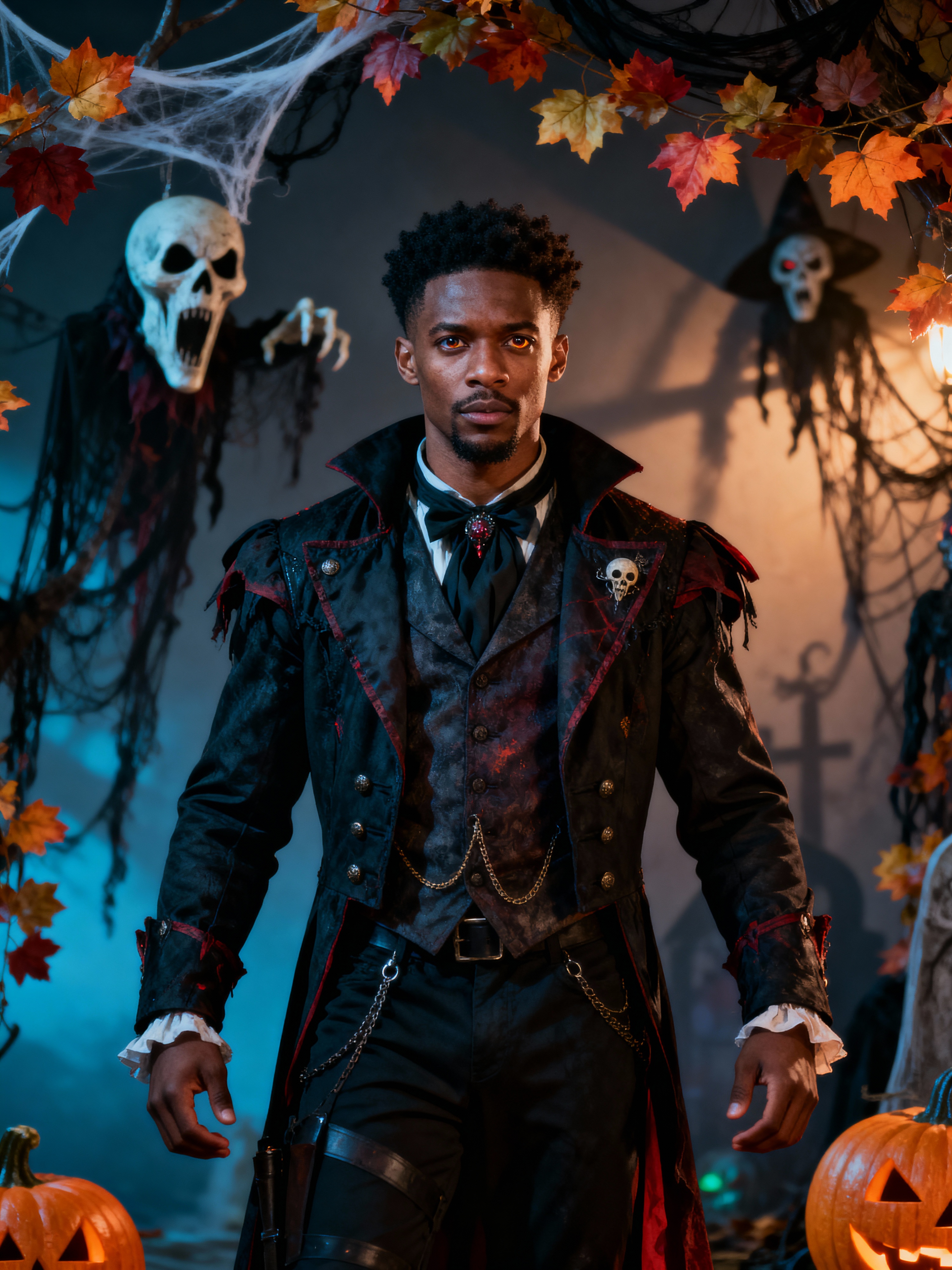 A model in a halloween costume, standing confidently in front of a Halloween-themed backdrop with spooky decorations and autumn leaves.