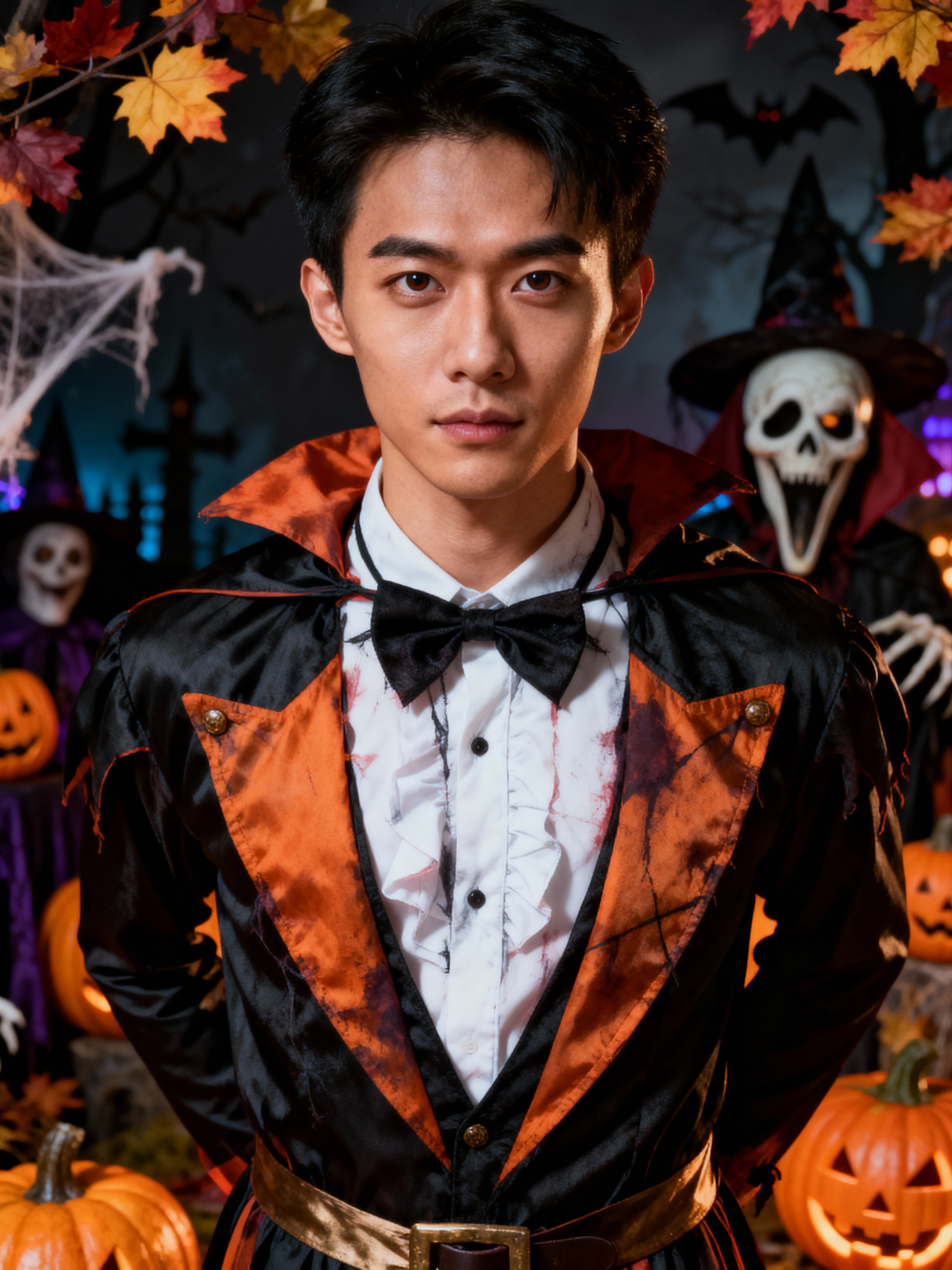 A model in a halloween costume, standing confidently in front of a Halloween-themed backdrop with spooky decorations and autumn leaves.