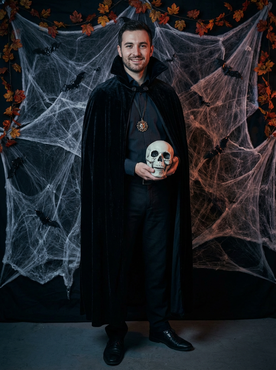 A model in a halloween costume, standing confidently in front of a Halloween-themed backdrop with spooky decorations and autumn leaves.