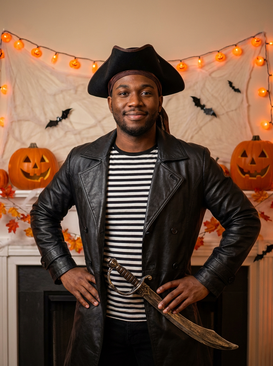 A model in a halloween costume, standing confidently in front of a Halloween-themed backdrop with spooky decorations and autumn leaves.