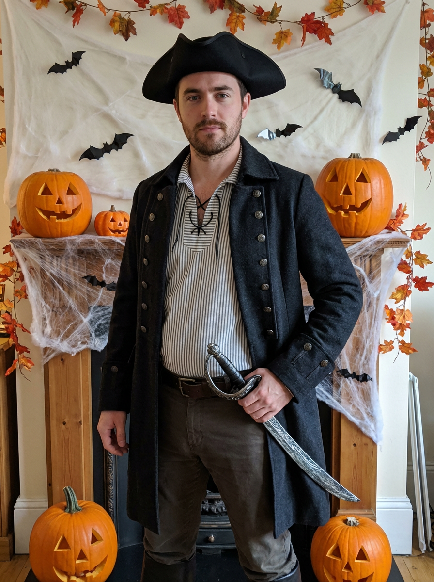 A model in a halloween costume, standing confidently in front of a Halloween-themed backdrop with spooky decorations and autumn leaves.