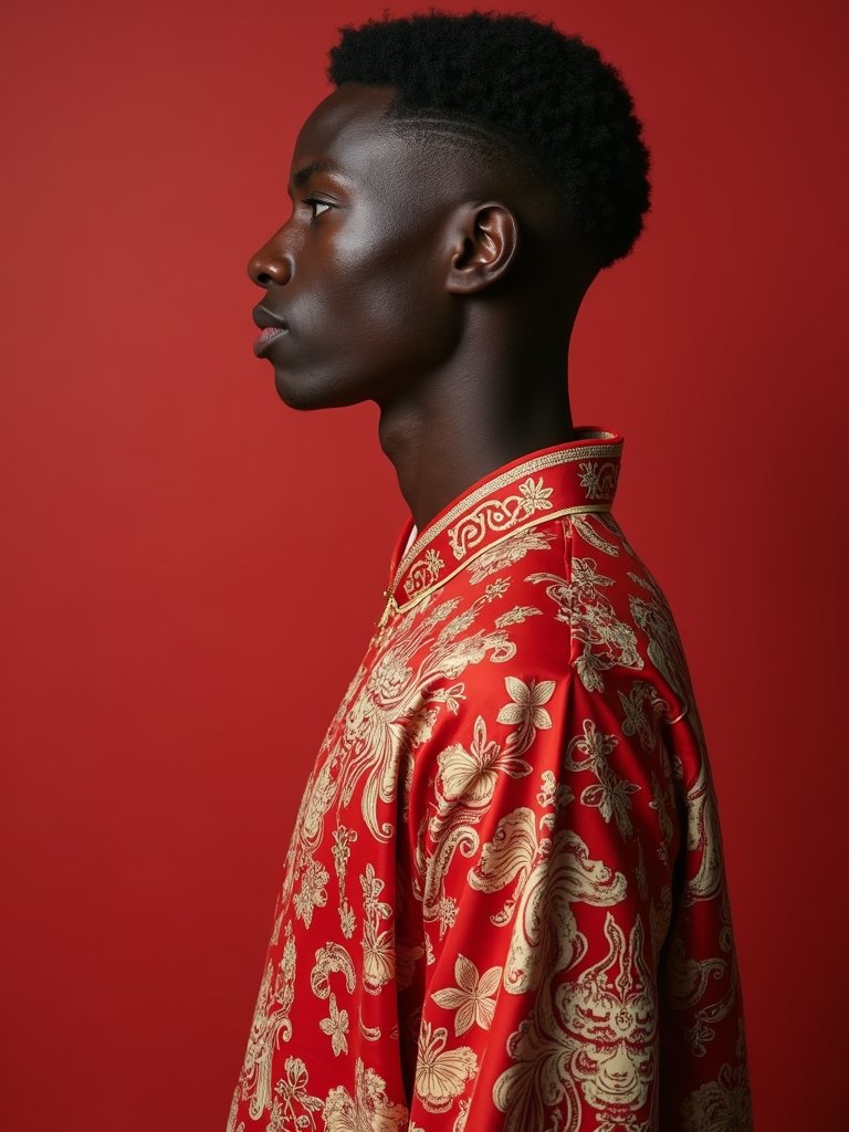 a model in a modern take on traditional clothes, embodying the balance of tradition and contemporary life during Chinese New Year