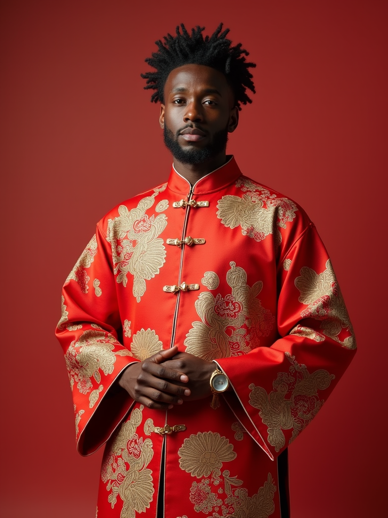 a model in a modern take on traditional clothes, embodying the balance of tradition and contemporary life during Chinese New Year