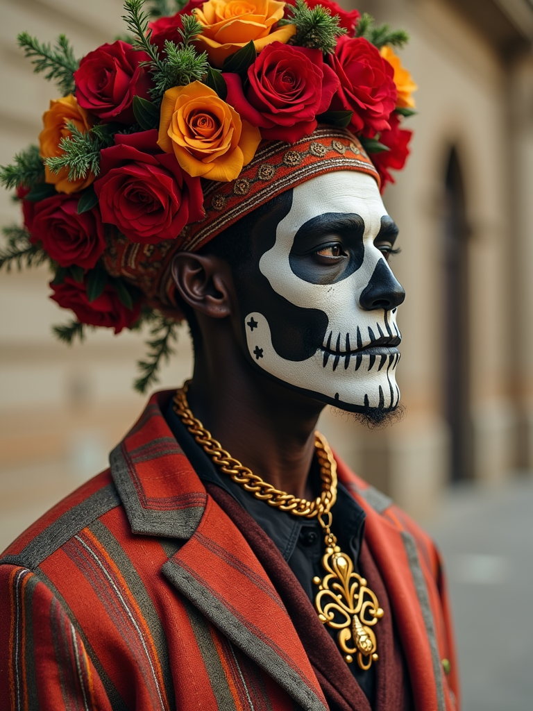 a model in a modern take on traditional clothes, embodying the balance of tradition and contemporary life during Day of the Dead