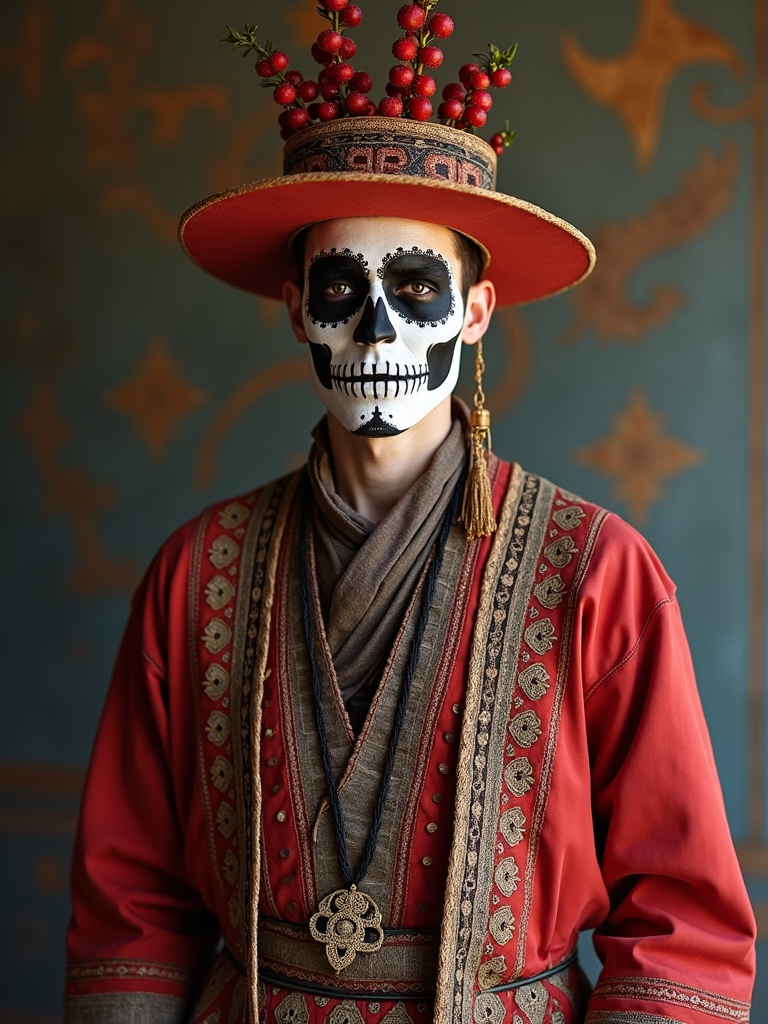 a model in a modern take on traditional clothes, embodying the balance of tradition and contemporary life during Day of the Dead
