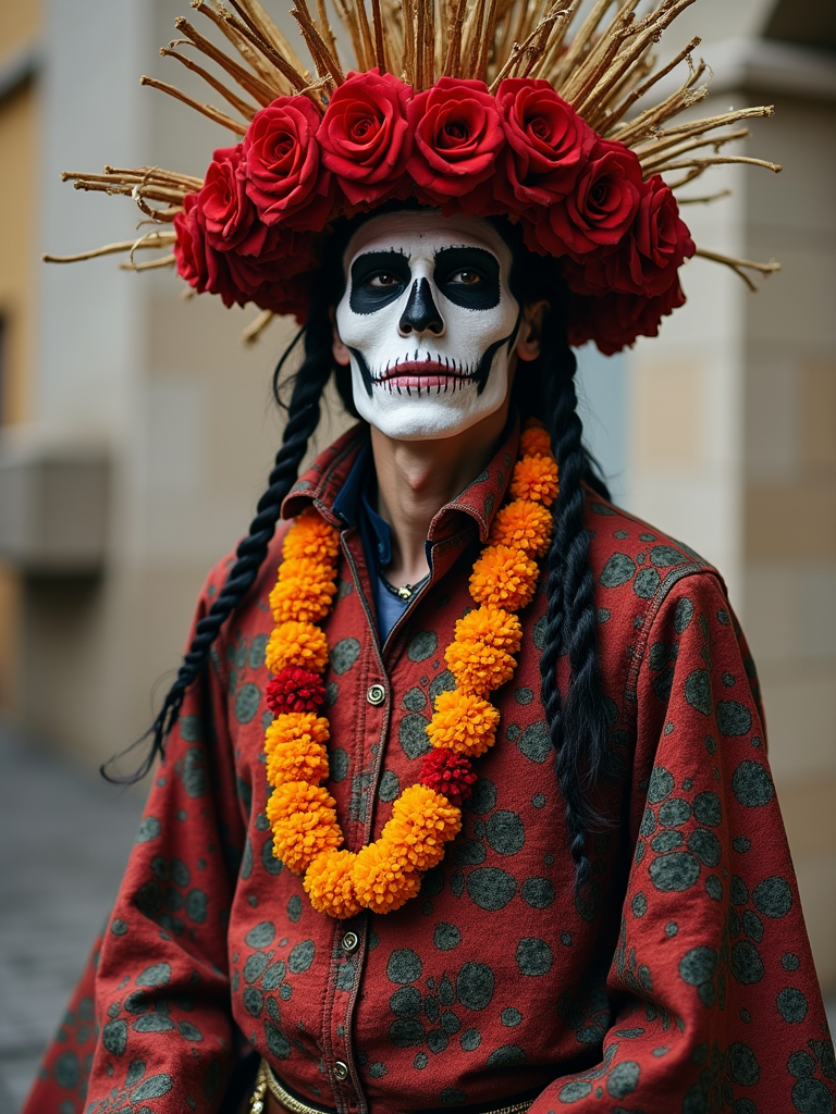 a model in a modern take on traditional clothes, embodying the balance of tradition and contemporary life during Day of the Dead