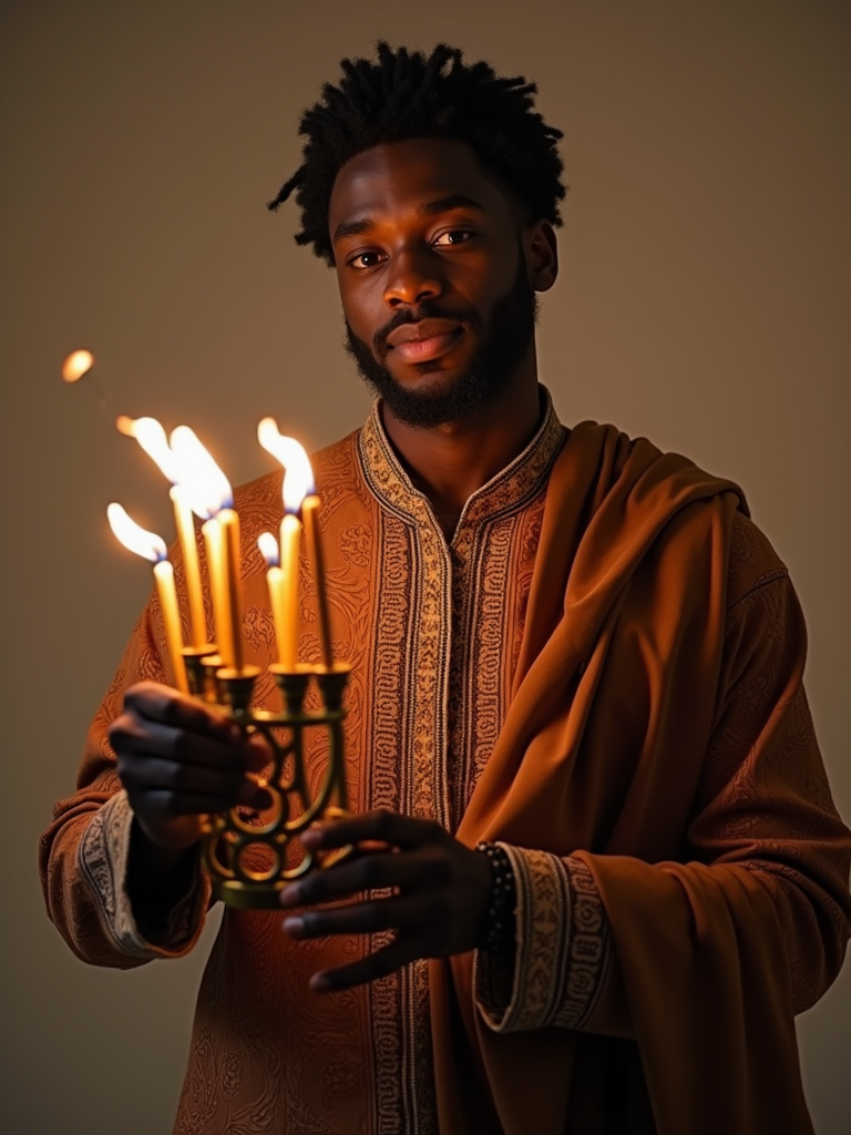 a model in a modern take on traditional clothes, embodying the balance of tradition and contemporary life during Hanukkah