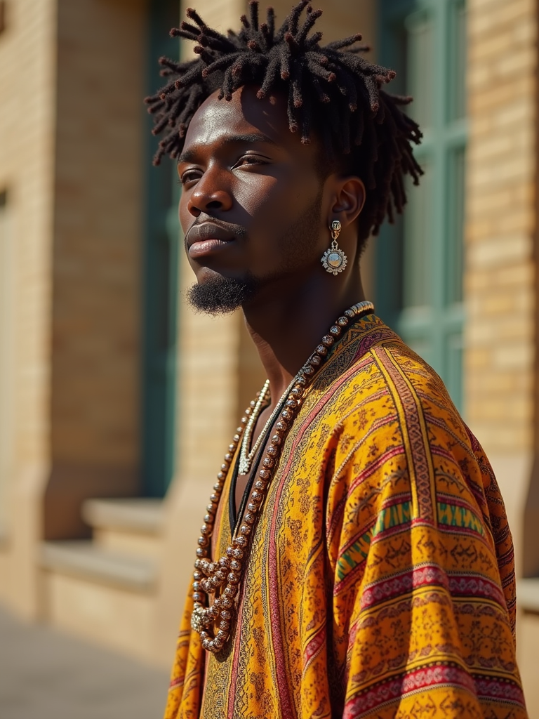 a model in a modern take on traditional clothes, embodying the balance of tradition and contemporary life during Eid