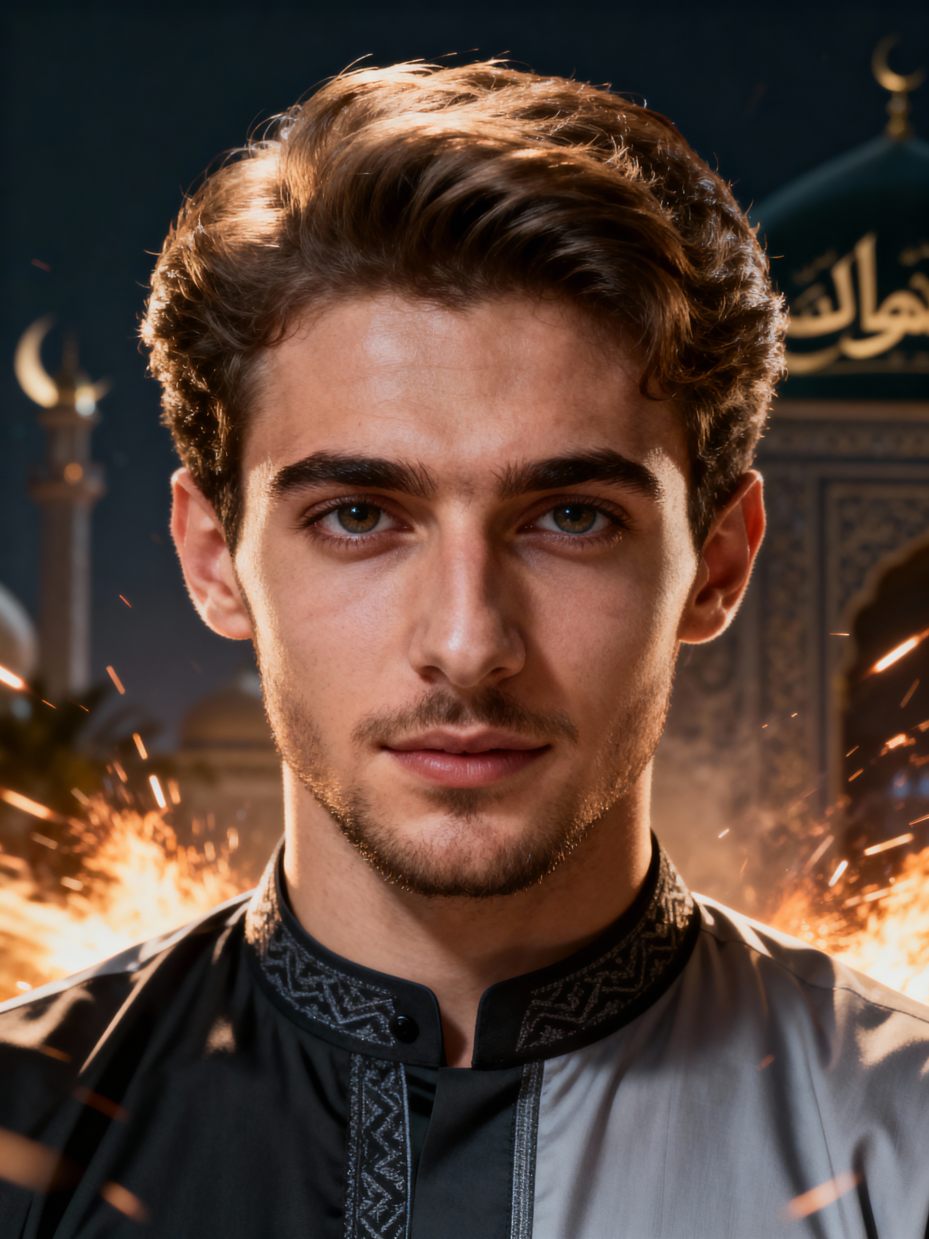 a model in a modern take on traditional clothes, embodying the balance of tradition and contemporary life during Eid