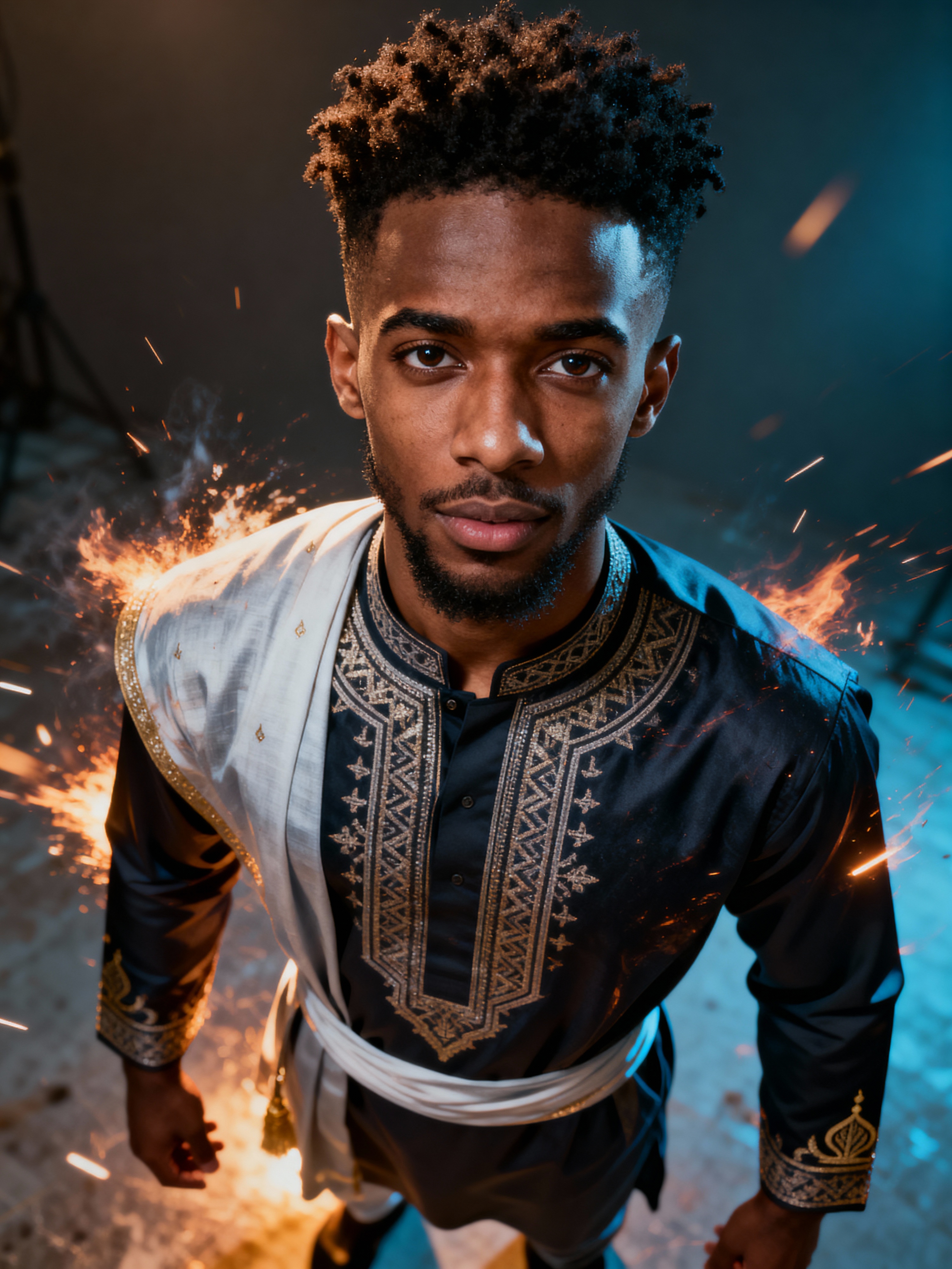 a model in a modern take on traditional clothes, embodying the balance of tradition and contemporary life during Eid