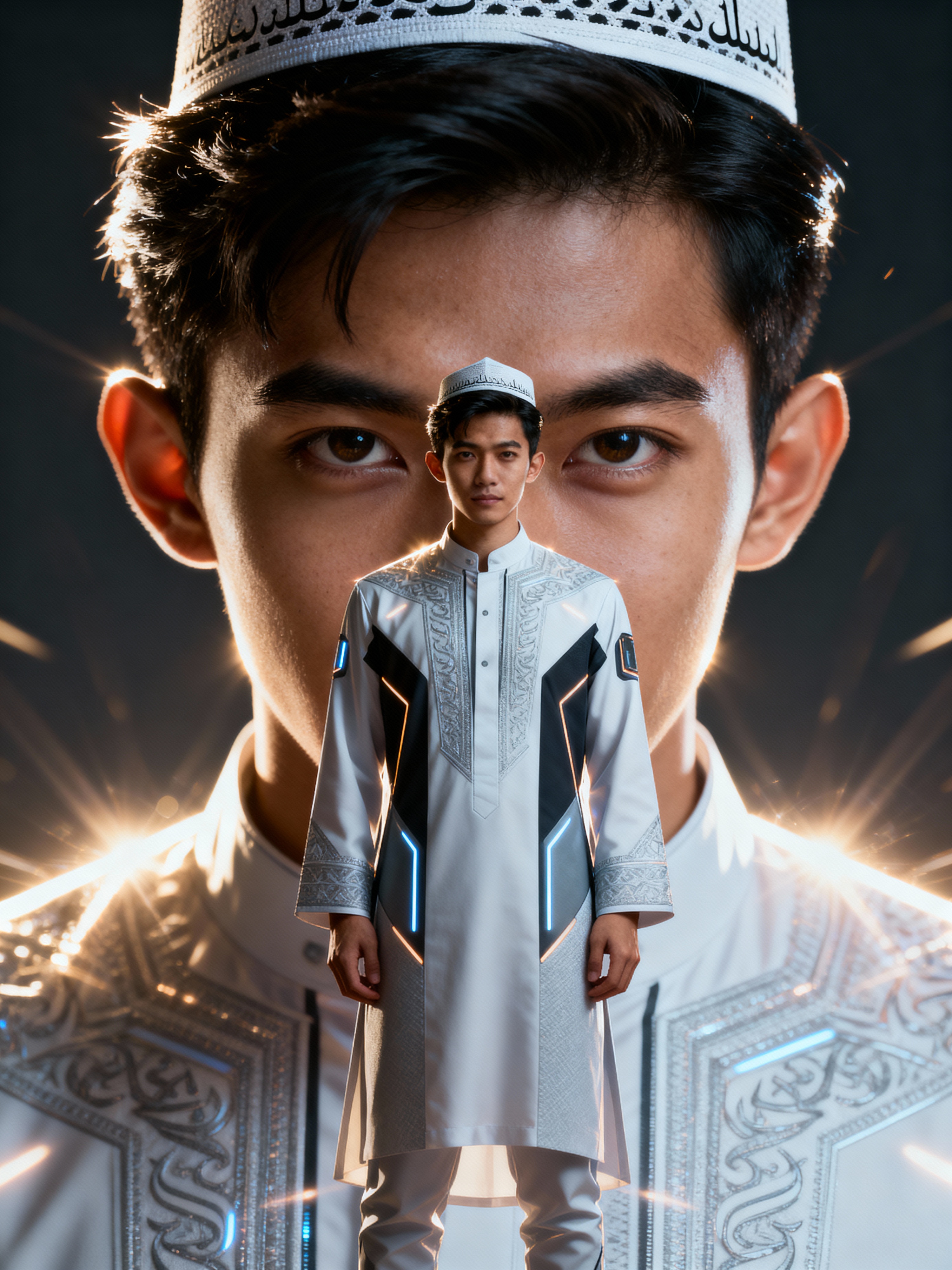 a model in a modern take on traditional clothes, embodying the balance of tradition and contemporary life during Eid