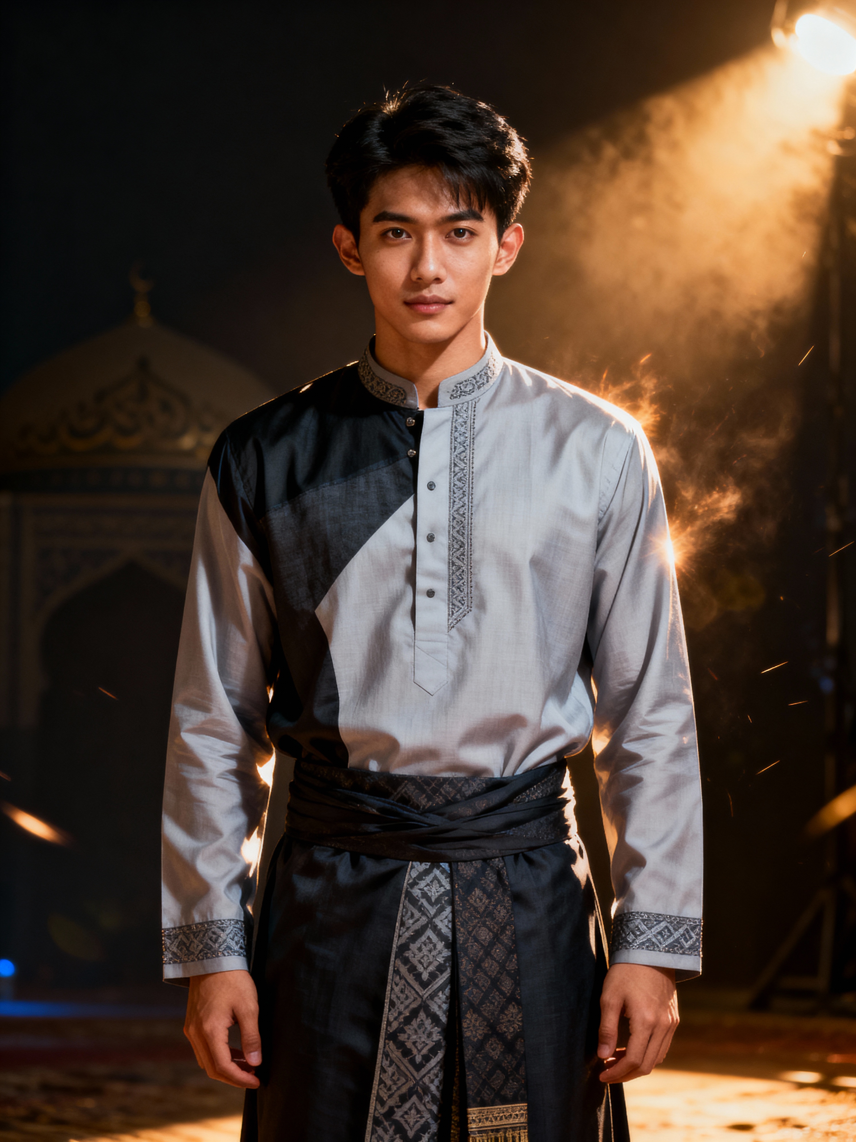 a model in a modern take on traditional clothes, embodying the balance of tradition and contemporary life during Eid