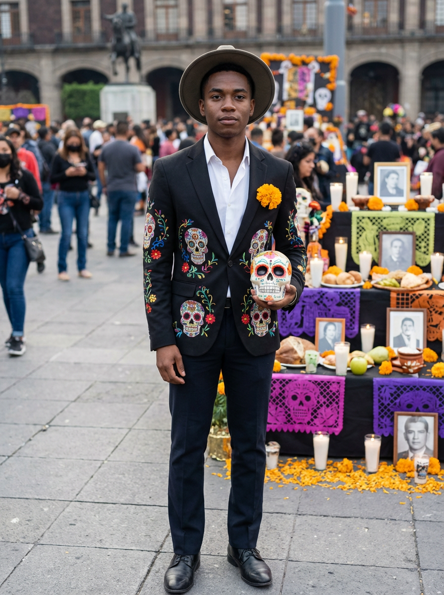 a model in a modern take on traditional clothes, embodying the balance of tradition and contemporary life during Day of the Dead