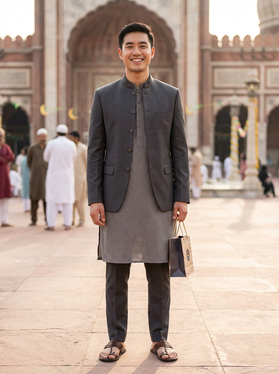 a model in a modern take on traditional clothes, embodying the balance of tradition and contemporary life during Eid