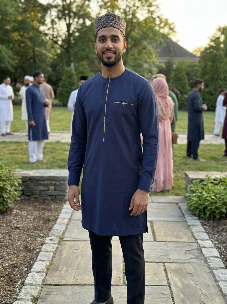 a model in a modern take on traditional clothes, embodying the balance of tradition and contemporary life during Eid