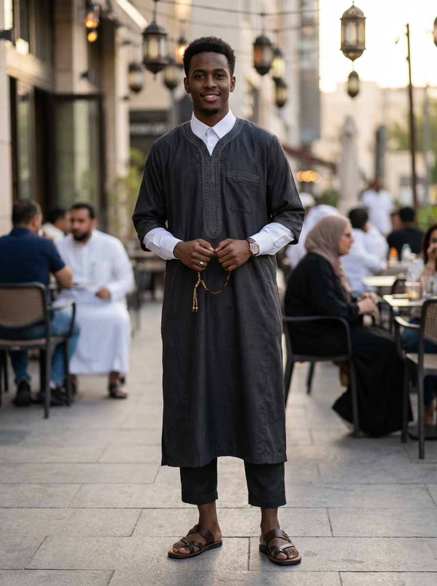a model in a modern take on traditional clothes, embodying the balance of tradition and contemporary life during Ramadan