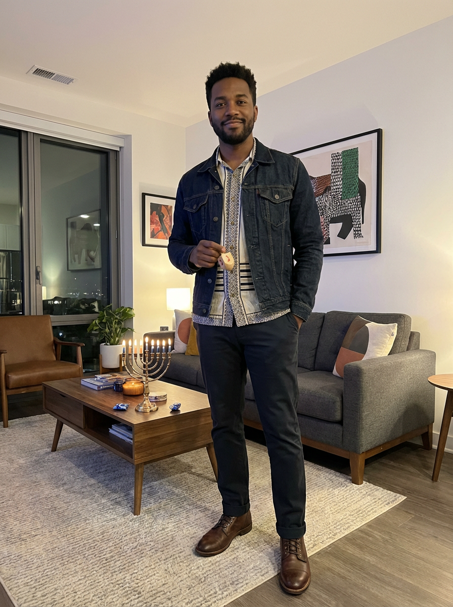 a model in a modern take on traditional clothes, embodying the balance of tradition and contemporary life during Hanukkah