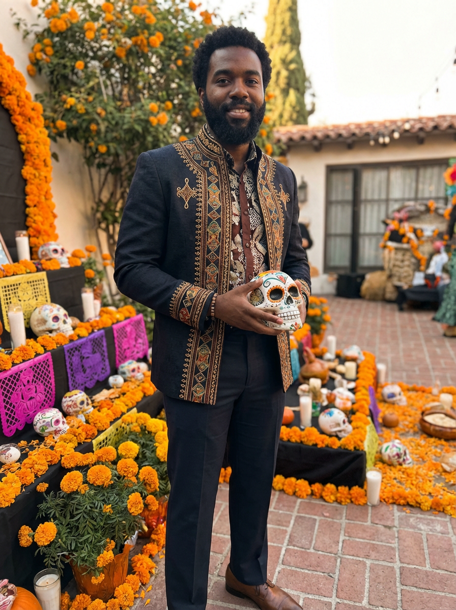 a model in a modern take on traditional clothes, embodying the balance of tradition and contemporary life during Day of the Dead