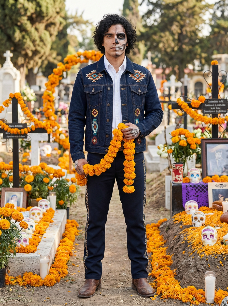 a model in a modern take on traditional clothes, embodying the balance of tradition and contemporary life during Day of the Dead