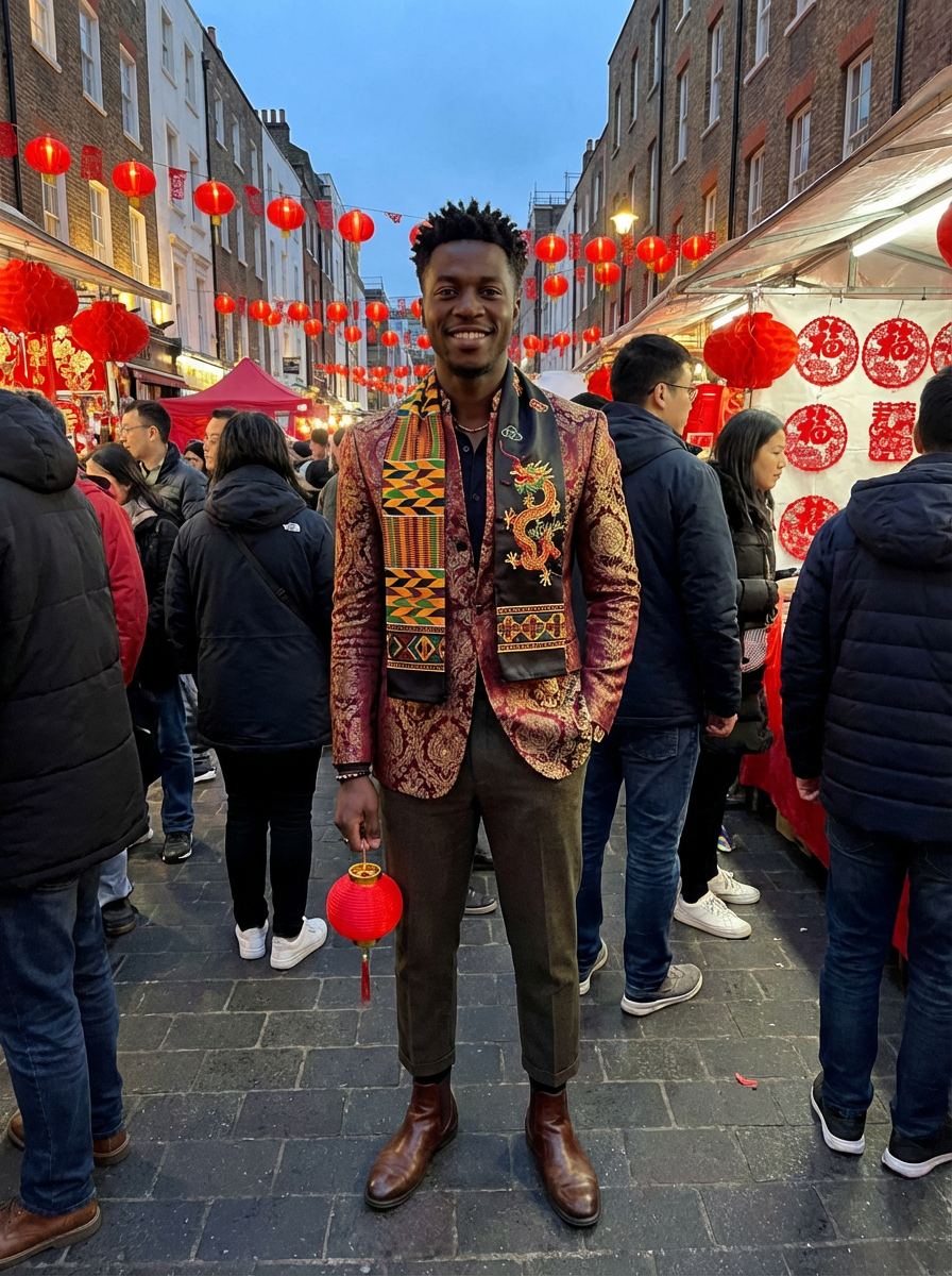 a model in a modern take on traditional clothes, embodying the balance of tradition and contemporary life during Chinese New Year