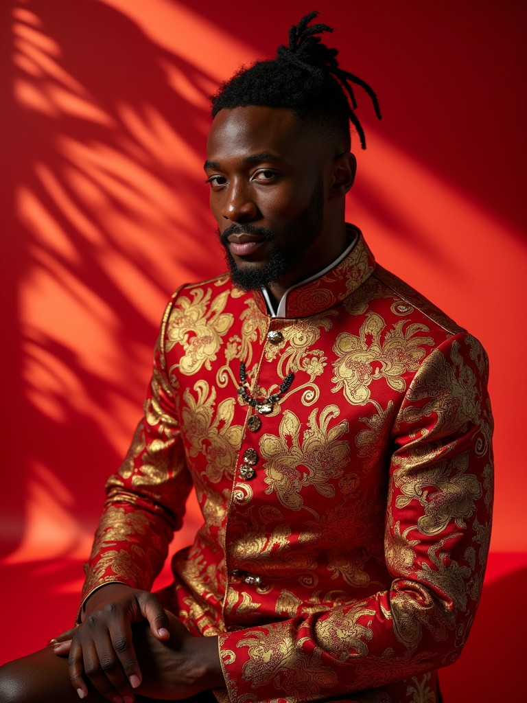 a model in a stylish outfit with traditional Chinese elements, striking a pose with beautiful red and gold decorations casting festive light patterns