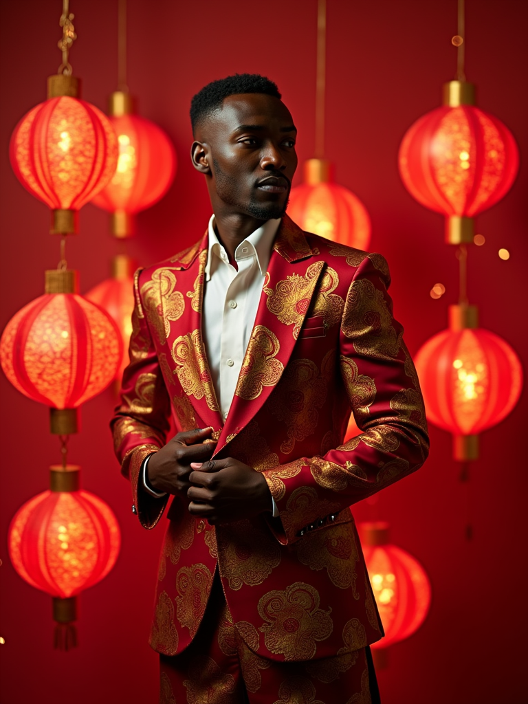 a model in a stylish outfit with traditional Chinese elements, striking a pose with beautiful red and gold decorations casting festive light patterns