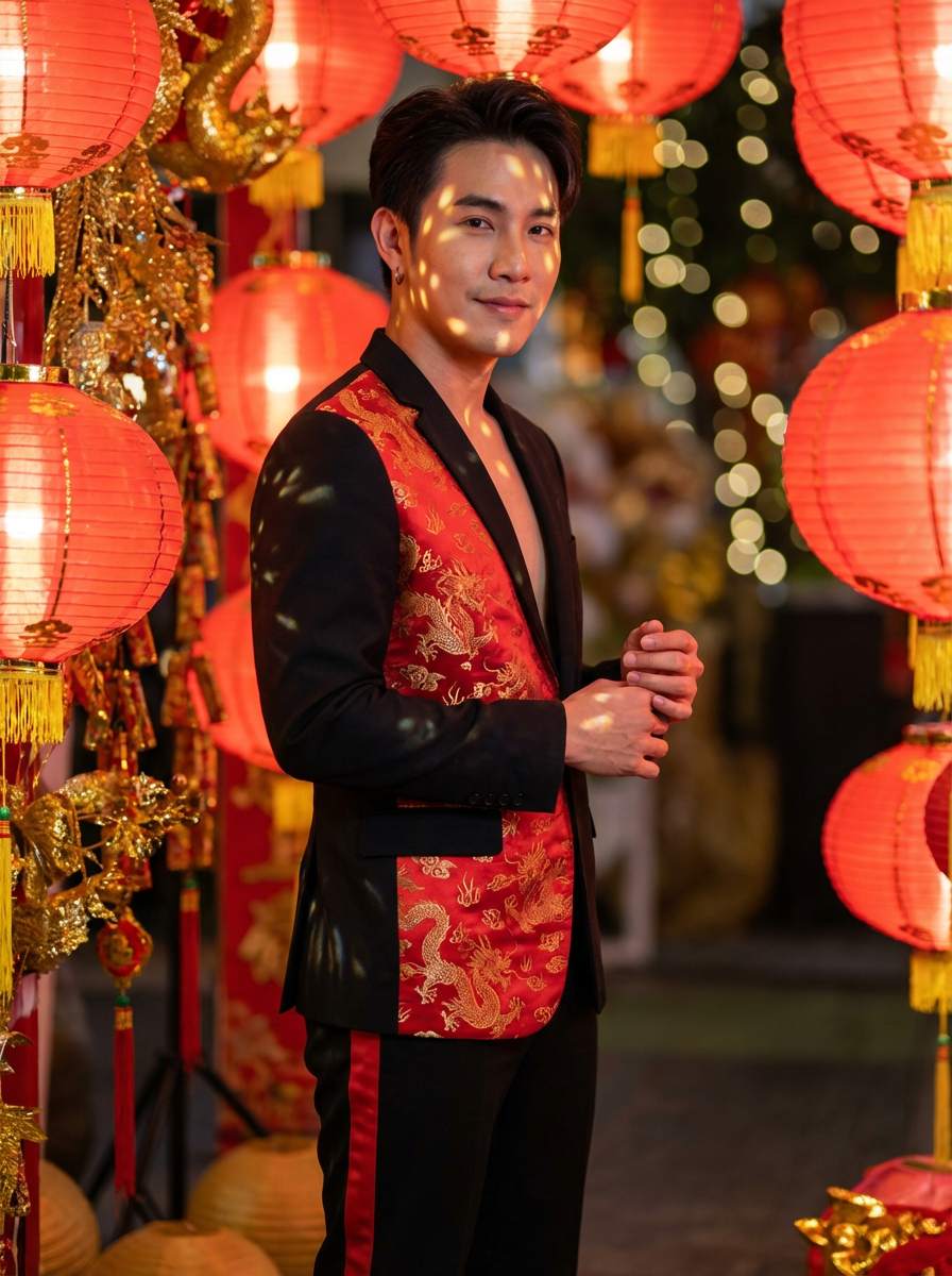 a model in a stylish outfit with traditional Chinese elements, striking a pose with beautiful red and gold decorations casting festive light patterns