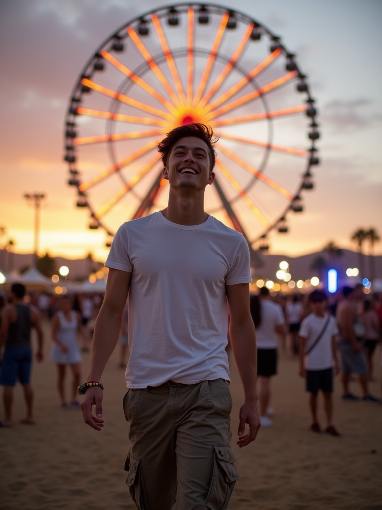 a model in a t-shirt and cargo pants, capturing their infectious energy and enthusiasm at Coachella, with the iconic ferris wheel glowing at dusk