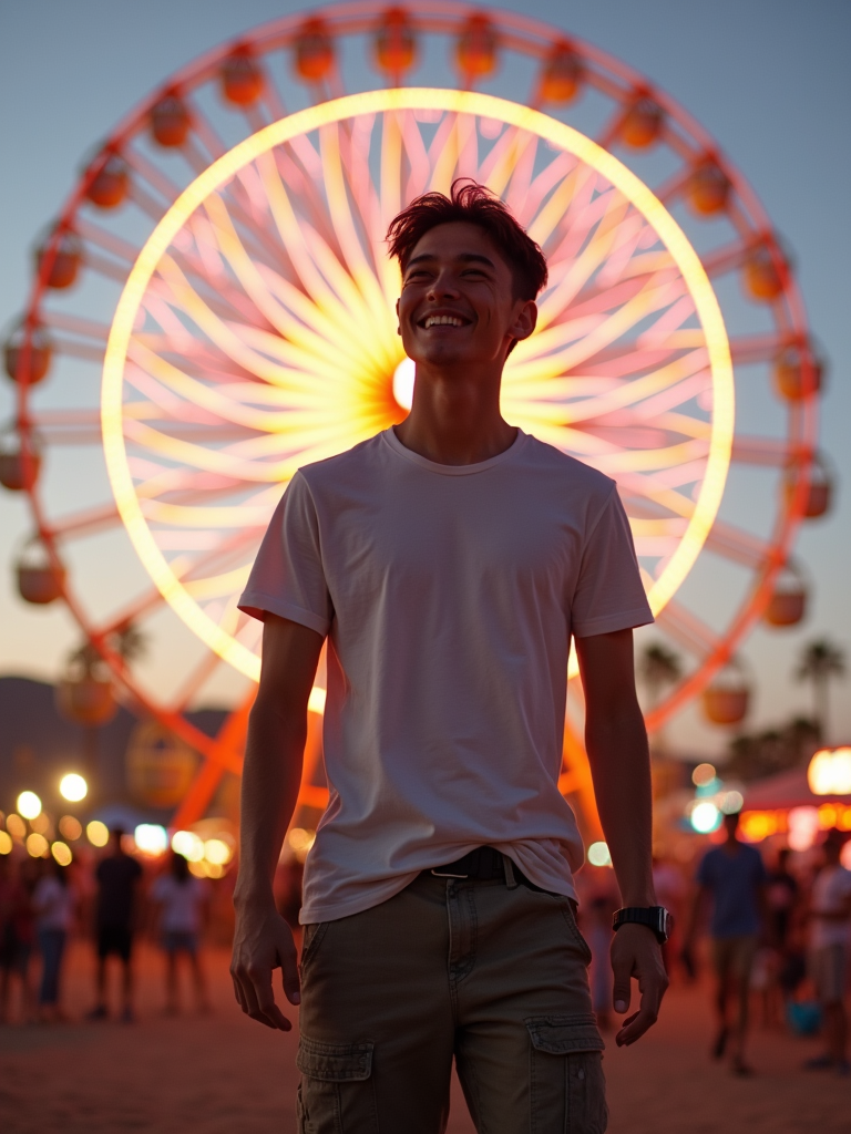 a model in a t-shirt and cargo pants, capturing their infectious energy and enthusiasm at Coachella, with the iconic ferris wheel glowing at dusk