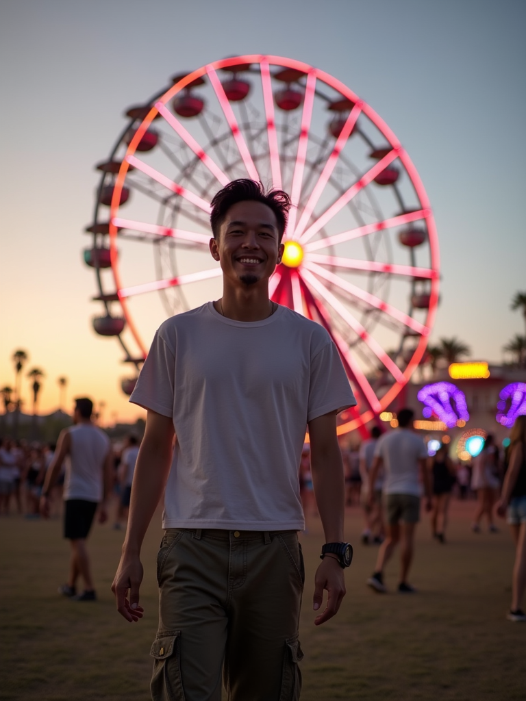 a model in a t-shirt and cargo pants, capturing their infectious energy and enthusiasm at Coachella, with the iconic ferris wheel glowing at dusk