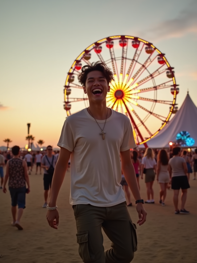 a model in a t-shirt and cargo pants, capturing their infectious energy and enthusiasm at Coachella, with the iconic ferris wheel glowing at dusk