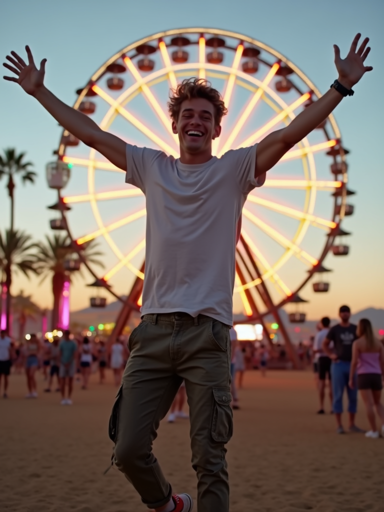 a model in a t-shirt and cargo pants, capturing their infectious energy and enthusiasm at Coachella, with the iconic ferris wheel glowing at dusk
