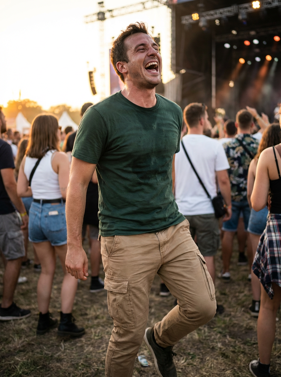 a model in a t-shirt and cargo pants, capturing their infectious energy and enthusiasm for the music