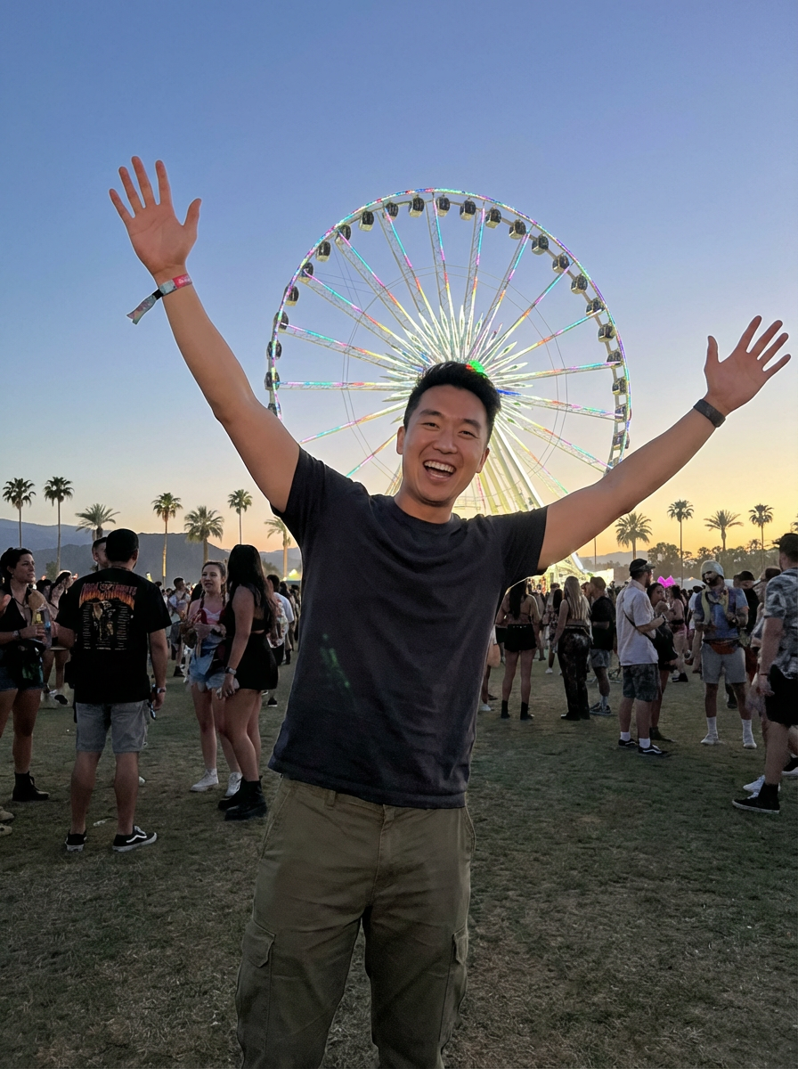 a model in a t-shirt and cargo pants, capturing their infectious energy and enthusiasm at Coachella, with the iconic ferris wheel glowing at dusk