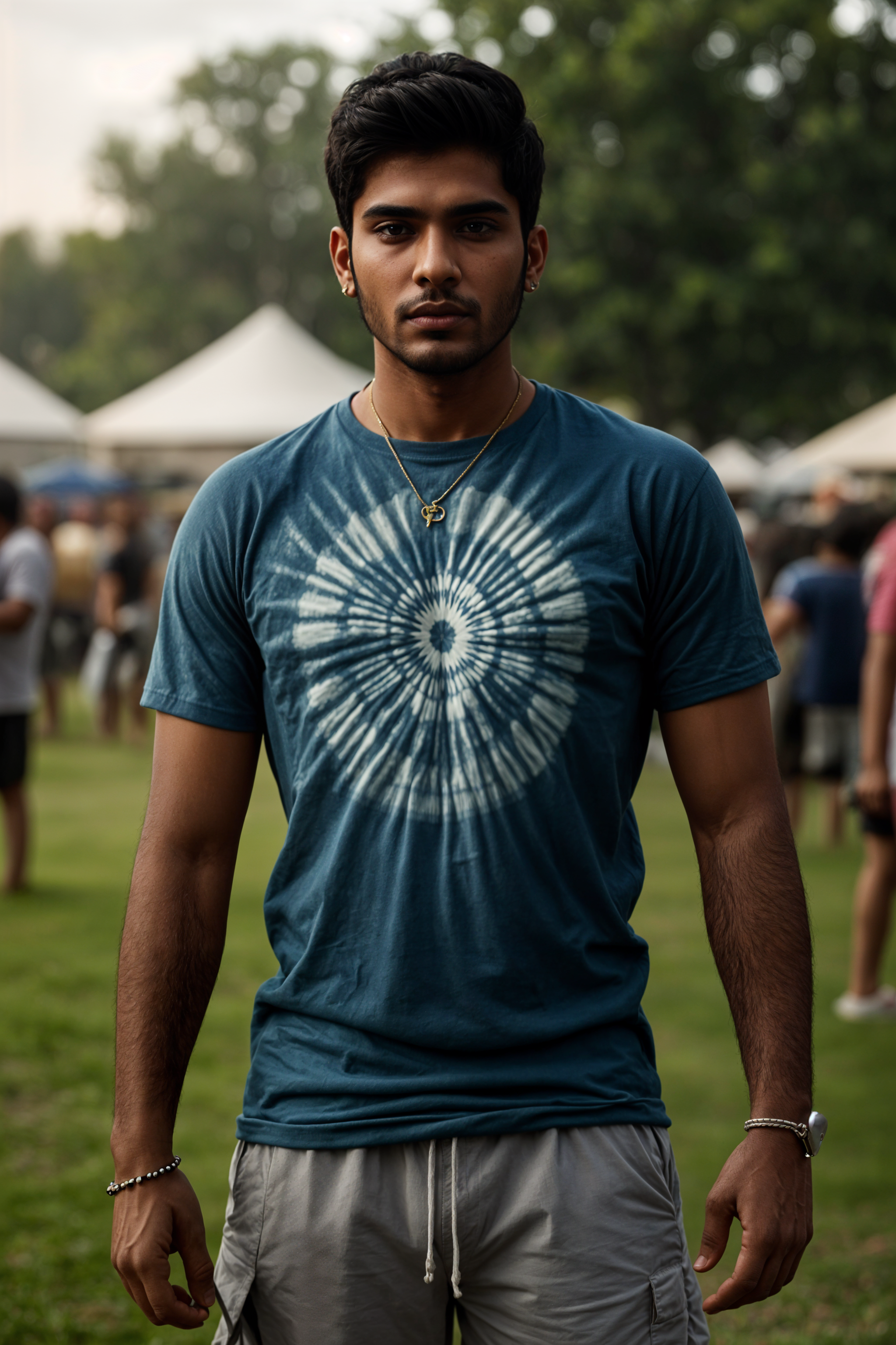 a model in a tie-dye t-shirt and cargo shorts, embodying the DIY and personalization culture of music festivals