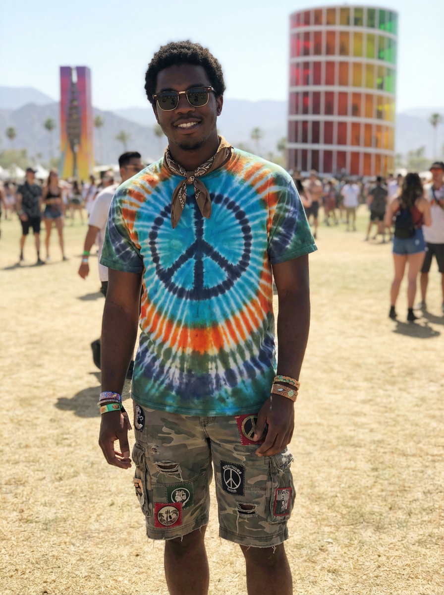 a model in a tie-dye t-shirt and cargo shorts, embodying the DIY fashion culture of Coachella in the Indio desert
