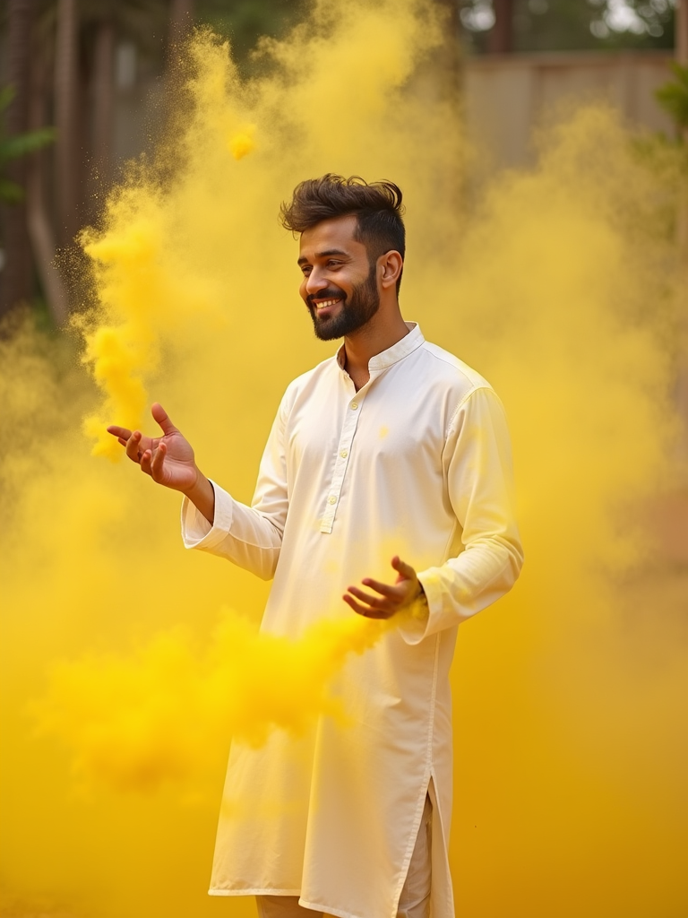 a model in a white kurta pajama now multicolored from the celebration, striking a pose while throwing handfuls of bright yellow powder
