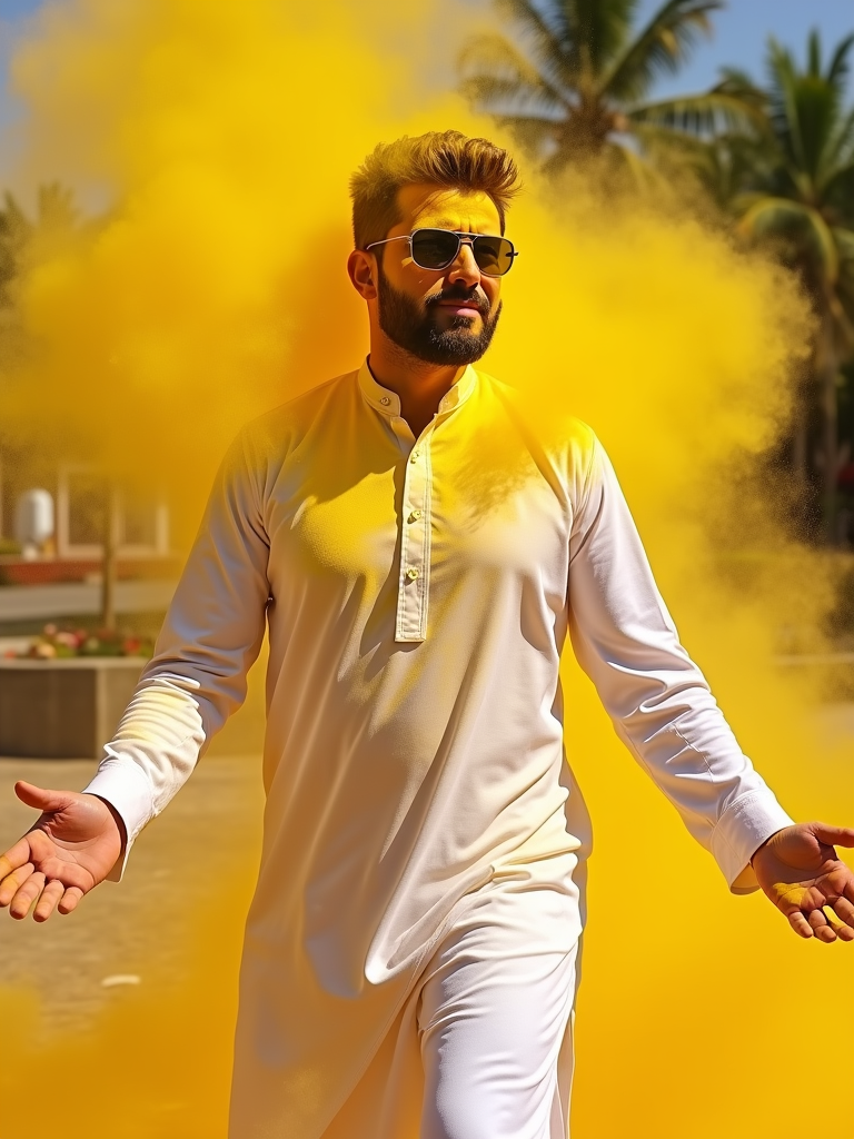 a model in a white kurta pajama now multicolored from the celebration, striking a pose while throwing handfuls of bright yellow powder
