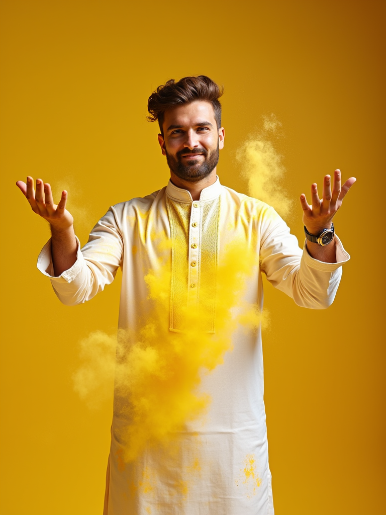 a model in a white kurta pajama now multicolored from the celebration, striking a pose while throwing handfuls of bright yellow powder