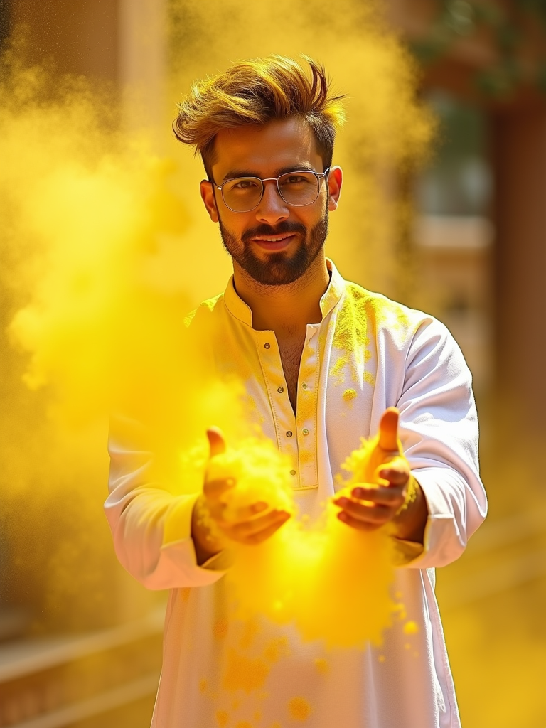 a model in a white kurta pajama now multicolored from the celebration, striking a pose while throwing handfuls of bright yellow powder