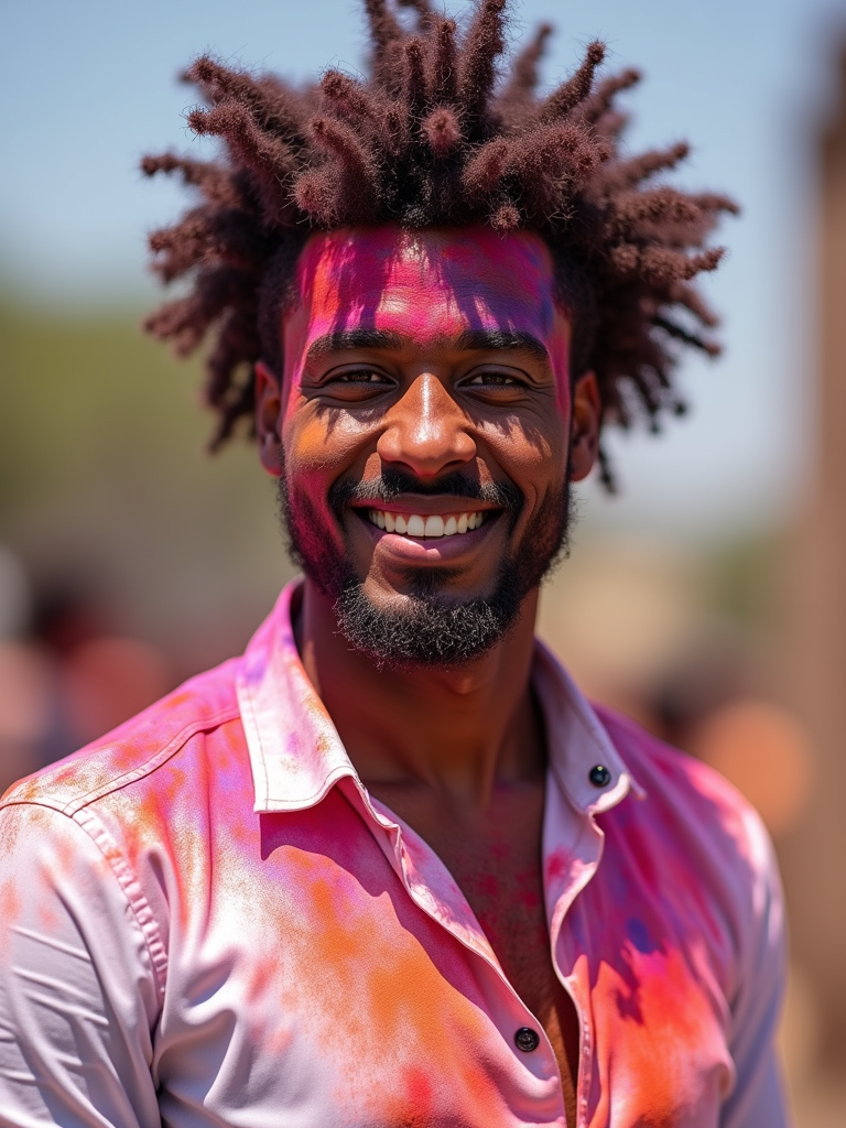 a model in a white shirt now covered with vibrant Holi colors, embodying the free-spirited and joyful nature of the festival of colors
