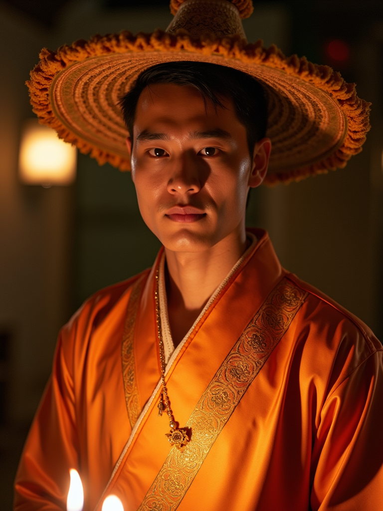 a model in an elegant Catrín outfit with traditional hat, striking a pose with beautiful marigold petals and candlelight casting warm patterns