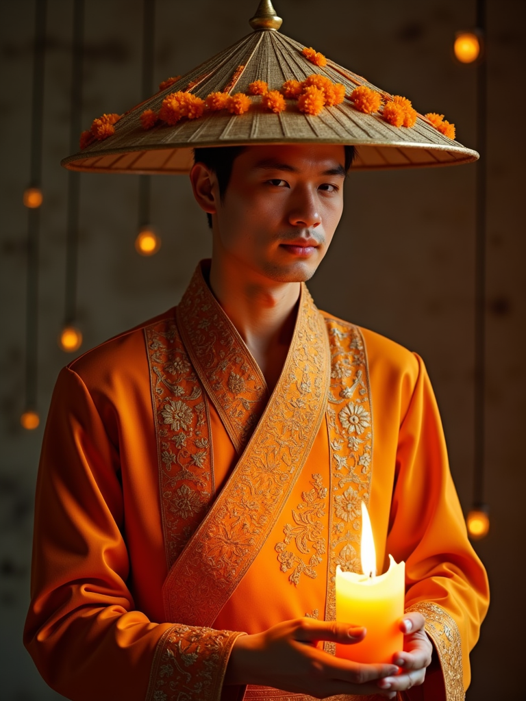 a model in an elegant Catrín outfit with traditional hat, striking a pose with beautiful marigold petals and candlelight casting warm patterns